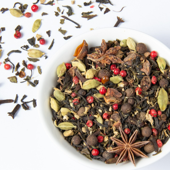 Este chai fusiona la potencia del té negro con la frescura del té verde y jengibre. Tiene presente los inconfundibles sabores especiados del clavo de olor, el anís y la pimienta rosada... La flor de jamaica da su toque de color y sabor levemente ácido.